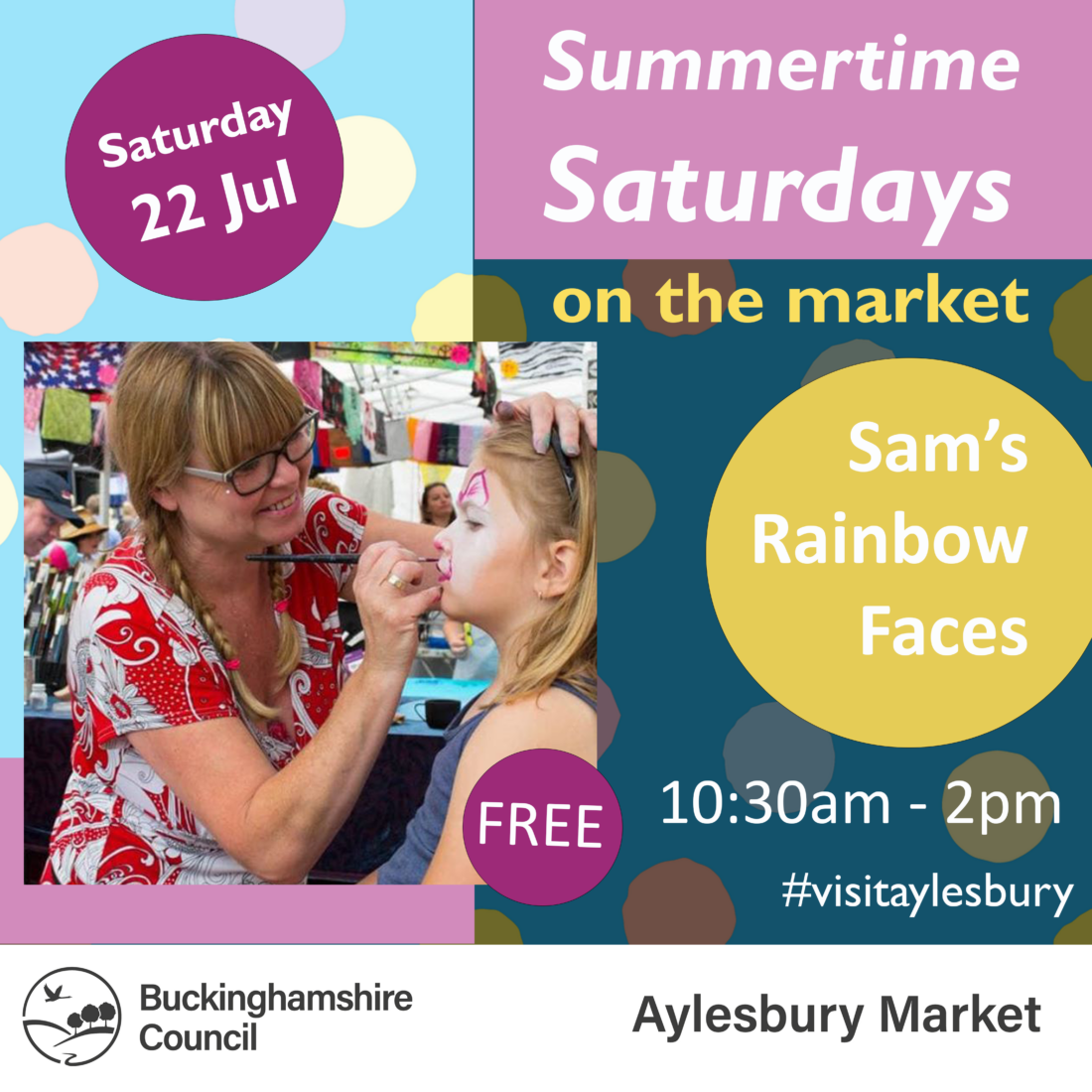 Jane Mason2023-07-19T18:27:44+01:00Join the summer holiday fun in Market Square with Sam's Rainbow Faces.