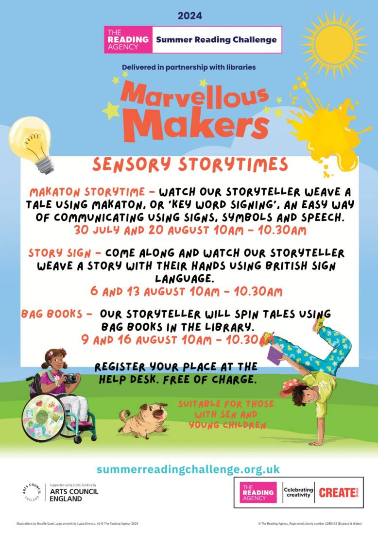 Our storyteller will spin tales using Bag Books in the library. Suitable for those with SEN and young children. Sensory Storytime is a 2024 Summer Reading Challenge, Marvellous Makers event.